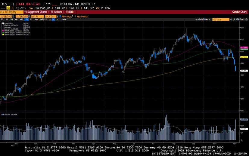 US equity markets pulled back last week as investors took profits from the outsized move higher seen following the US election. Sticky inflation prints, coupled with solid retail sales and hawkish comments from Federal Reserve Chairman J. Powell, sent interest rates higher, giving investors another reason to sell the market. Powell said, “The economy is not sending any signals that we need to be in a hurry to cut rates.” The probability of a twenty-five basis point rate cut at the Fed’s December meeting fell from nearly 80% to 55% off his comments. President-elect Trump’s announcements of some controversial anti-establishment cabinet nominees also influenced the markets. For instance, his pick to head the Department of Health and Human Resources, Robert Kennedy Jr- a vaccine skeptic, catalyzed a sell-off in the healthcare sector, which fell by 5.5% in the week.